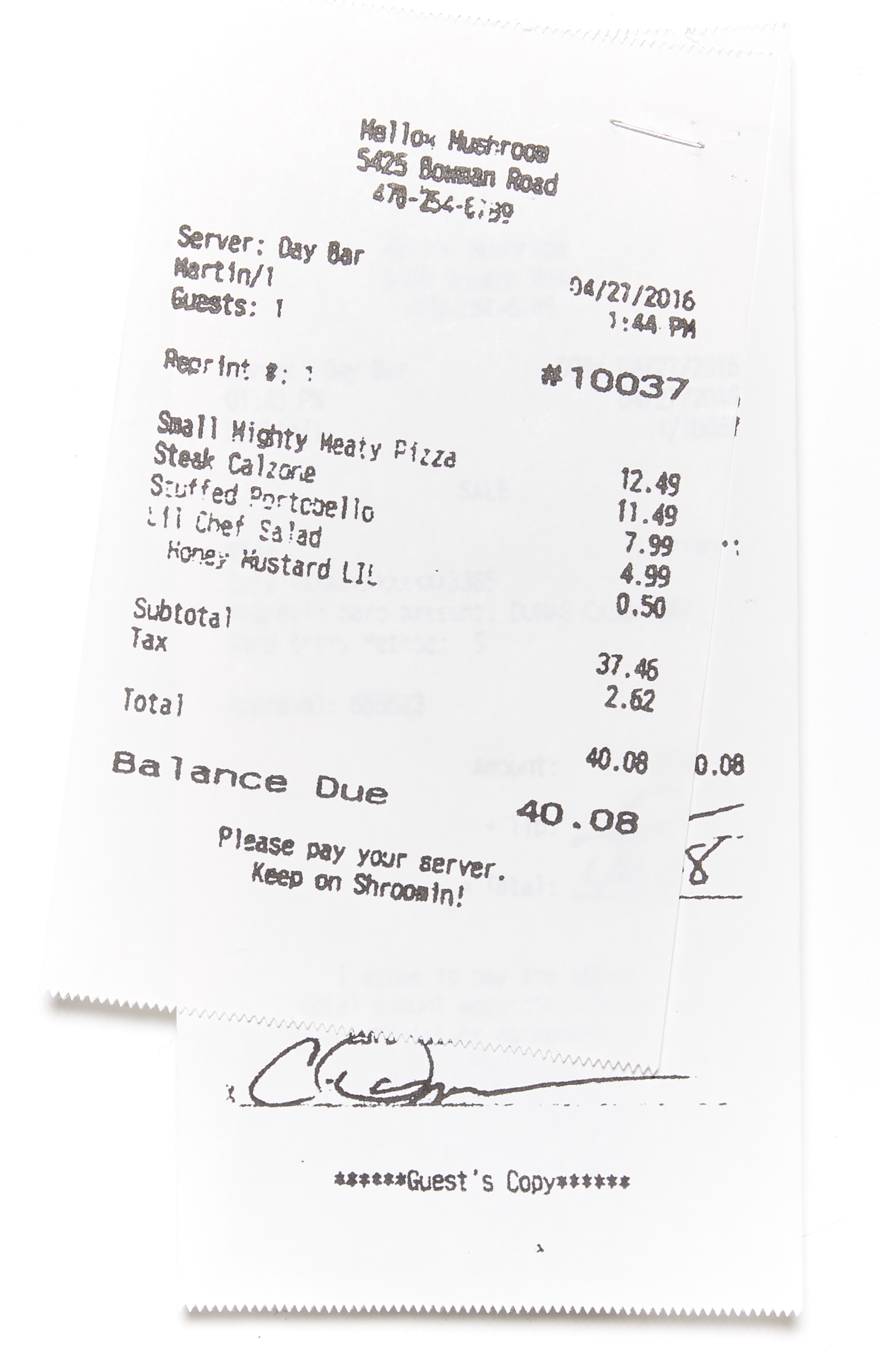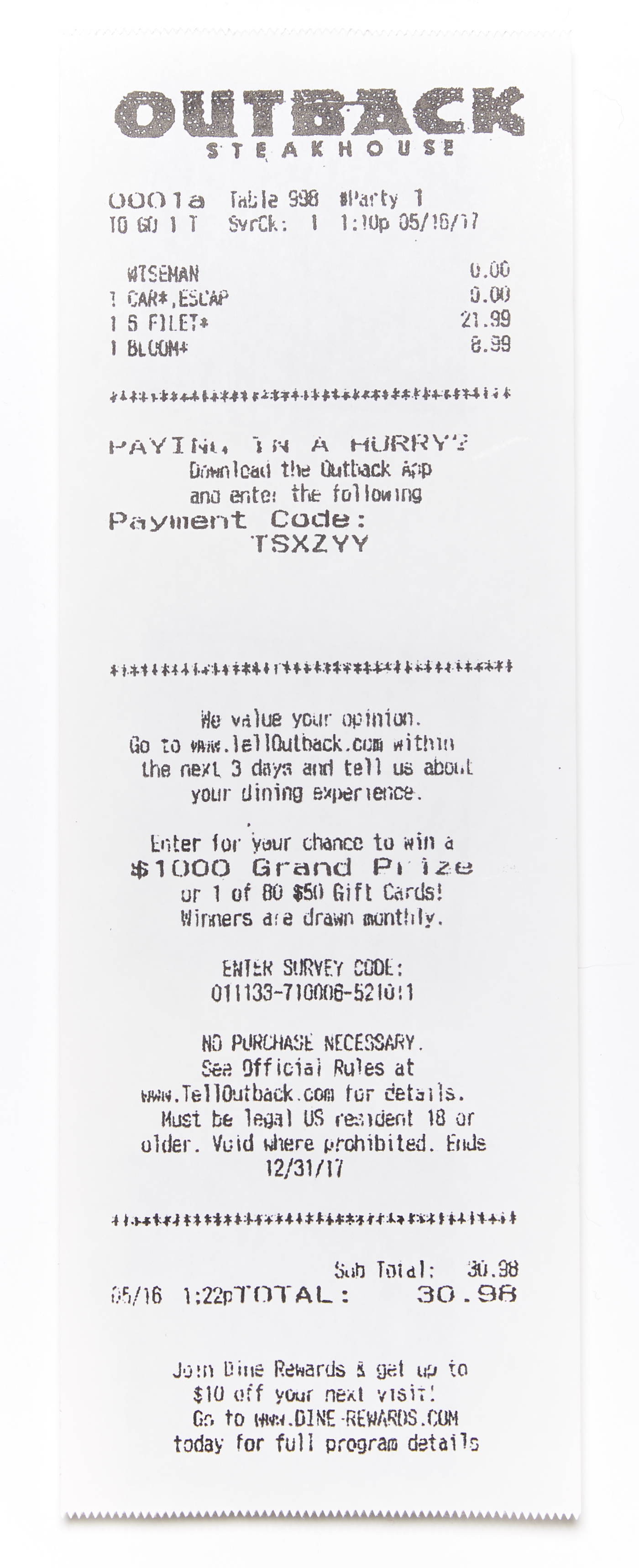 These receipts illuminate the powerful, often invisible administrative infrastructure shepherding commerce and law; the anonymous back offices spinning with clerical duties. The receipts provide granular paper trails of commutes to fast food restaurants and minutes sitting in drive-thru lanes; of the names of store managers and servers and cashiers; of $0 tips. The receipts reveal the fingerprints of bureaucracy—employees’ handwritten notes, a wonky staple. The receipts generate questions; “Dine-In”?